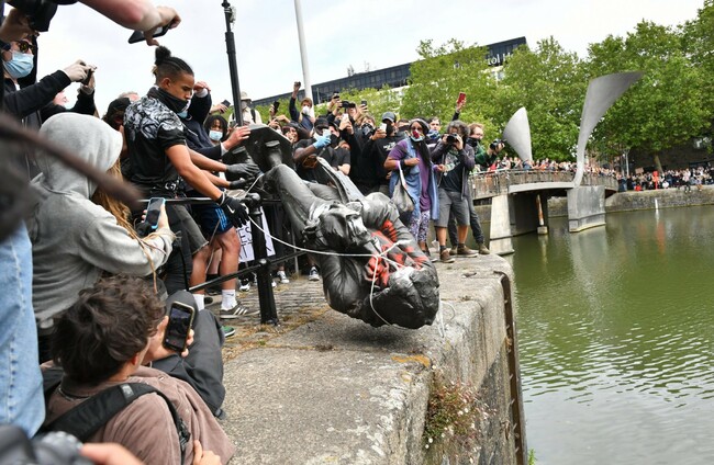 The statue of Edward Colston before it is thrown into Bristol harbour PA