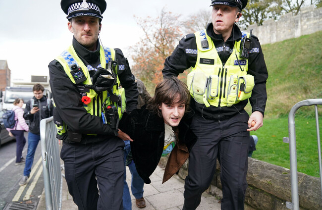 Police detain a protester after he appeared to throw eggs at the King and Queen Consort as they arrived for a ceremony at Micklegate Bar in York, where the Sovereign is traditionally welcomed to the city Jacob King/PA
