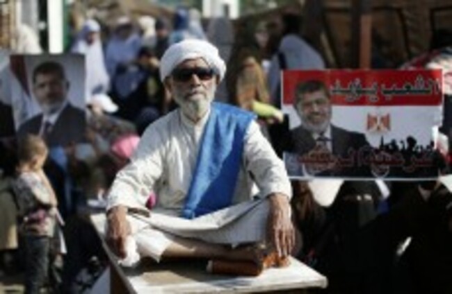 A supporter of Egypt's Islamist President Mohammed Morsi sits in front a poster with Arabic that reads, "the people support legitimacy for the president in Cairo today. Hassan Ammar/AP/Press Association Images