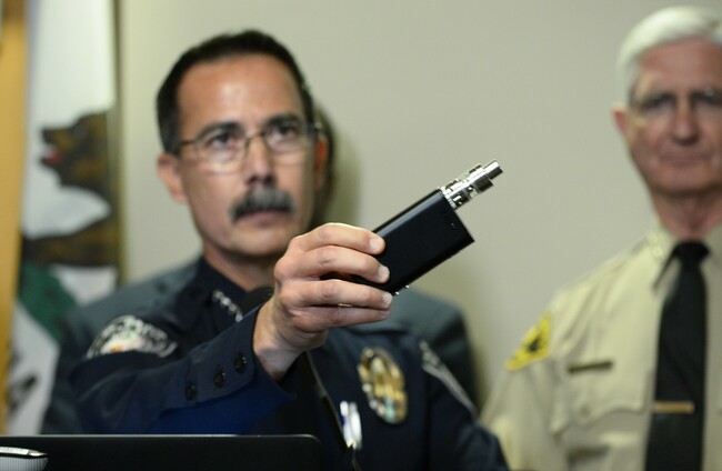 El Cajon Police Department Captain Jeffery Davis holds up a vape device similar to the one that they claim that Alfred Olango was holding when he was shot. AP