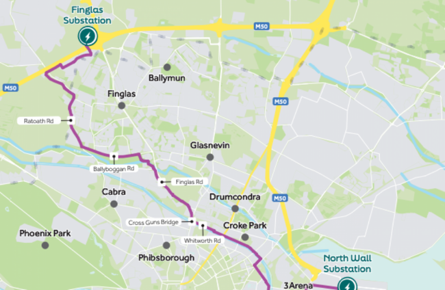 From there it will cross the Finglas Road and head through Phibsborough at Cross Guns Bridge, before heading down Whitworth Road alongside the Royal Canal, through Ballybough and onto the 3Arena, before reaching North Wall substation.