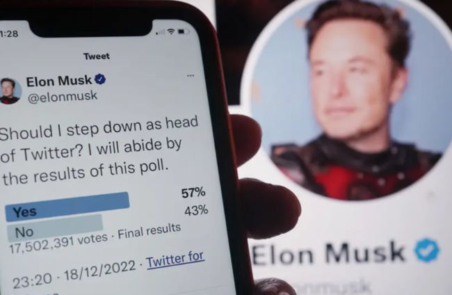 More than 57% of users who voted in a Twitter poll Musk posted on Sunday night said he should step down – a result he said he would abide by.