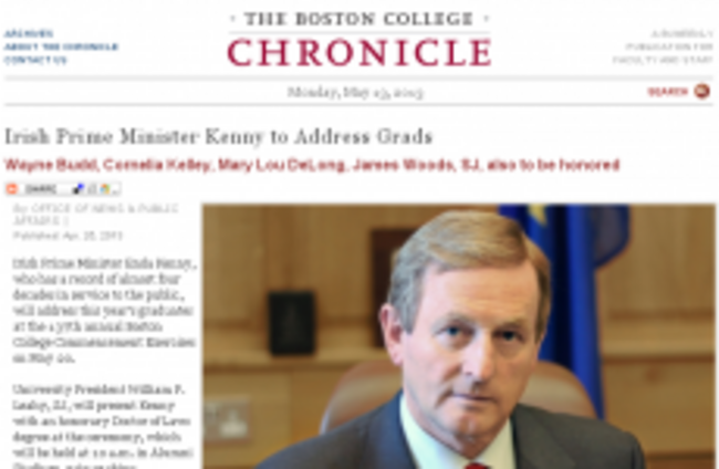 BOSTON COLLEGE, WHERE Enda Kenny is due to speak in a week’s time, has cited his ”significant role” in the “Celtic Tiger era of economic growth” in a profile on its website.