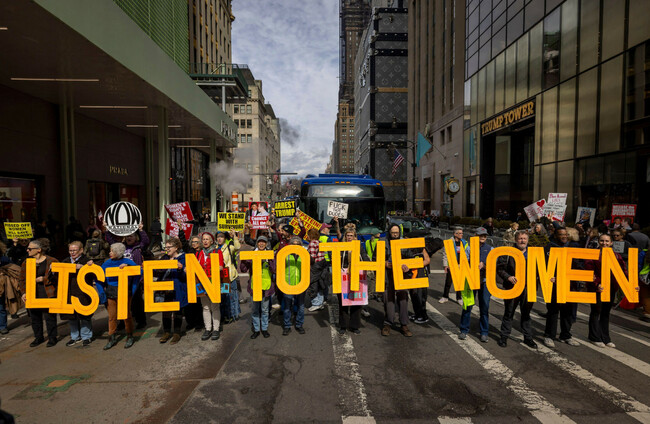 File photo of people protesting in New York on International Women's Day, demanding the unredacted release of all the Epstein files Alamy
