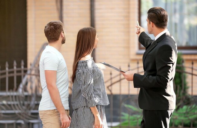 Estate agent showing a property to young buyers. Alamy Stock Photo