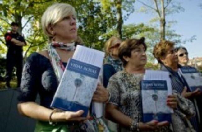 Relatives of people killed by the Basque armed group ETA protest with several books with the history of more than eight hundred people killed by ETA, during the International Conference in San Sebastian, northern Spain on Monday. Alvaro Barrientos/AP/Press Association Images