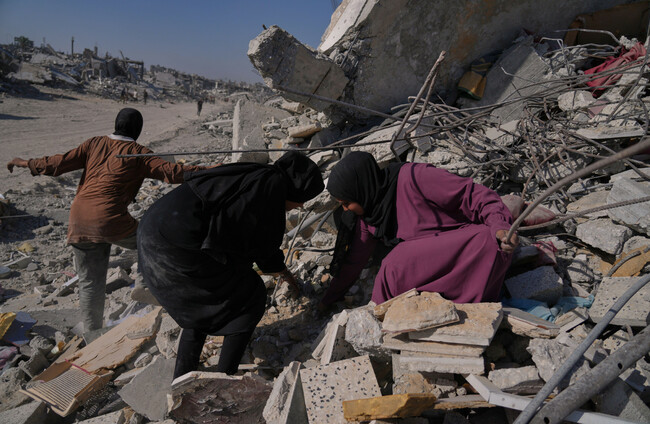 Displaced Palestinian women inspect rubble of a building as they return to Khan Younis in southern Gaza Strip on Saturday, 11 Oct., 2025 Alamy Stock Photo