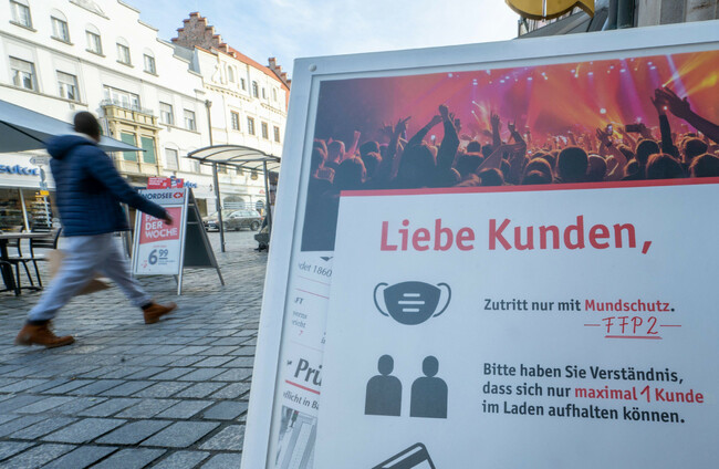 "Dear customers, access only with mask FFP2" is written on a sign in front of a shop in Straubing, Germany. Armin Weigel/dpa/Alamy Live News