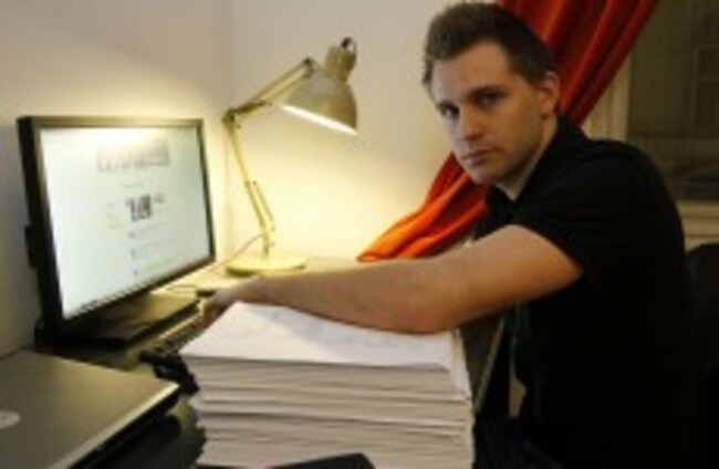 Max Schrems sits with files about his activities on his Facebook account that Facebook handed over to him last year. Ronald Zak/AP/Press Association Images