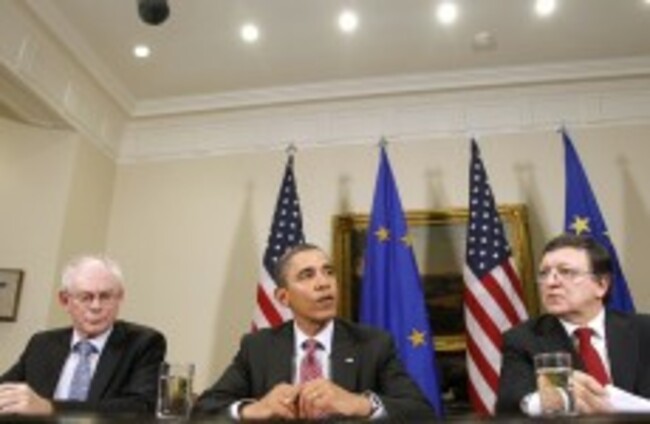 File photo of President Barack Obama, flanked by European Council President Herman Van Rompuy, left, and European Commission President Jose Manuel Barroso. Haraz N Ghanbari/AP/PA