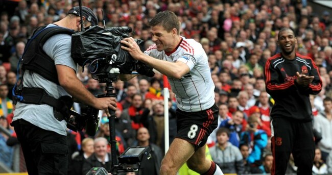 Liverpool's Steven Gerrard hugs a TV camera at Old Trafford in 2010. An ECJ ruling could have major implications for the lucrative TV rights that propel the Premier League. Gareth Copley/PA Archive