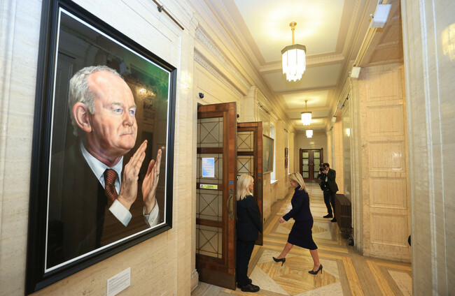 featureimage Sinn Fein Vice President Michelle O’Neill in the Great Hall at Parliament Buildings next to a portrait of Martin McGuinness at Stormont, before a sitting of the Northern Ireland Assembly where where she is expected to be named Northern Ireland’s first nationalist first minister. PA PA
