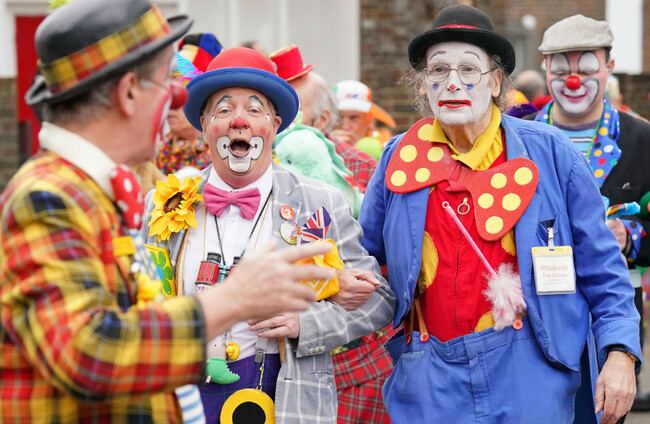 Clowns arrive at the annual Grimaldi Clown Service at All Saints in Hackney, London. Now in its 78th year, the event sees people pay their respects to Joseph Grimaldi, who popularised the role of clowns in British pantomimes, as well as their slapstick humour and striking make-up. Jonathan Brady/PA