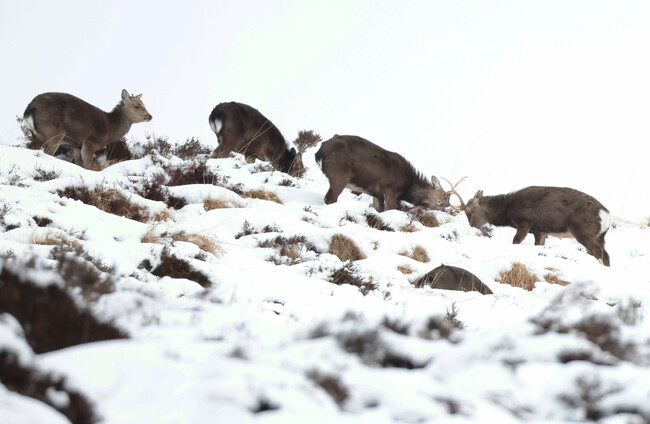 2 Wild Deer Wild Sika Deer In The Snow. Two young stags locking antlers. Part of a herd of wild sika deer searching for food in the snow in the Wicklow Mountains today. Eamonn Farrell / RollingNews.ie Eamonn Farrell / RollingNews.ie / RollingNews.ie