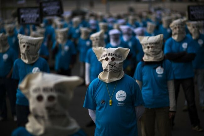 Masked demonstrators, employees from the Telefonica phone company, protest on a street near a building where executives from the same company are participating in a business meeting in Barcelona Spain. (AP Photo/Emilio Morenatti)
