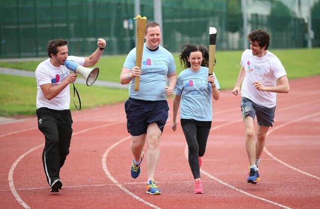 Arc Torch of Hope Relay 4 TV3 RedRock actor David Crowley (left) with Carl Brady and Edwina Halpin, both Cancer Survivors and torch bearers along with Vikings actor Charlie Kelly (right), at the launch of the ARC Cancer Support Centres' Torch of Hope Relay which takes place on Sunday 9 October. ROBBIE REYNOLDS PHOTOGRAPHY ROBBIE REYNOLDS PHOTOGRAPHY
