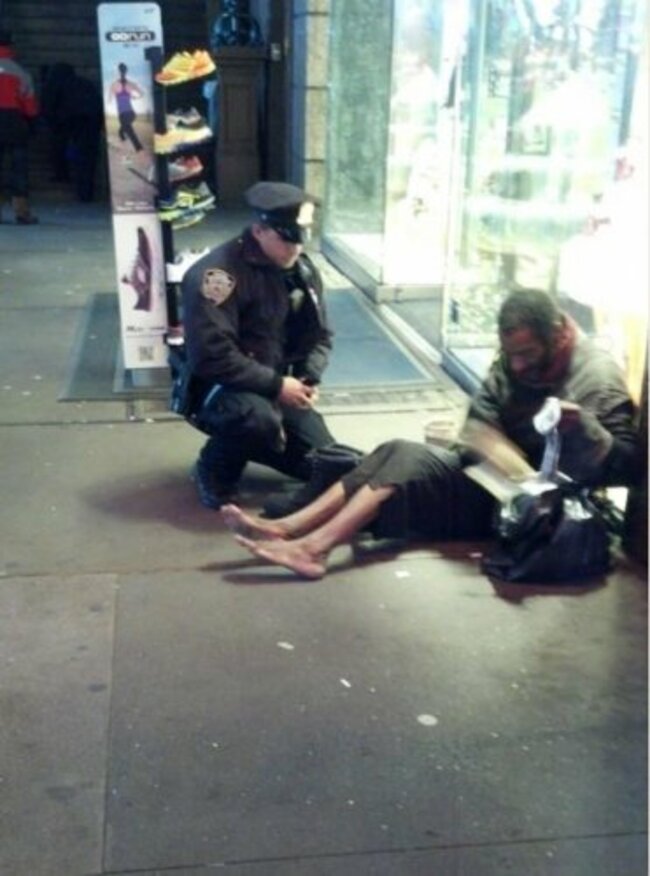 • Bear with us while we wipe away the tears here. One cold November night, an NYPD officer in Times Square encountered a barefoot homeless man (both are in the photo above). What he did next was incredibly generous – and had it not been for a tourist who snapped a photo on her mobile phone, would have gone unnoticed. Sniff.