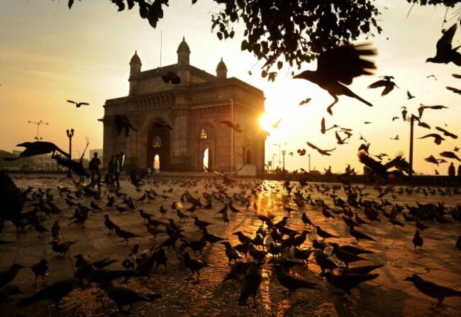 Pigeons and crows are silhouetted as the sun rises behind the Gateway of India in the Apollo Bunder area of Mumbai, India. Pic: Anthony Devlin/PA Wire