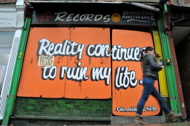 A closed down shop in Nottingham city centre with a facade that reads, ‘Reality continues to ruin my life’ after the record shop business went bust. (Lewis Stickley/PA Wire)