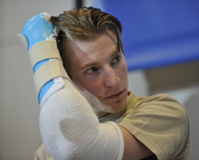 Brendan Marrocco uses his transplanted arm to brush his hair back during a news conference in Baltimore today. Marrocco received a transplant of two arms from a deceased donor after losing all four limbs in a 2009 roadside bomb attack in Iraq. (AP Photo/Gail Burton)