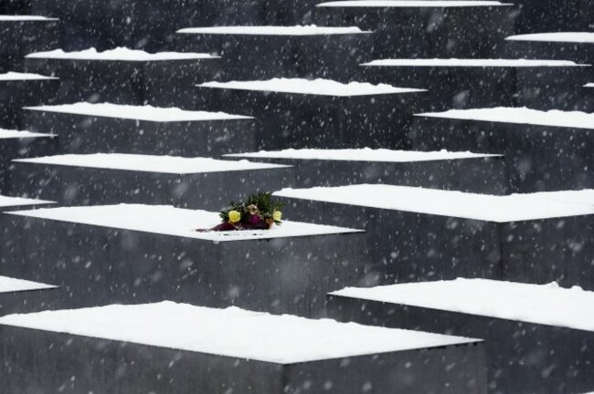 Flowers lay on a slab of the Holocaust Memorial to commemorate the victims of the Nazi regime at the International Holocaust Remembrance Day in Berlin, yesterday, January 27. (Markus Schreiber/AP)