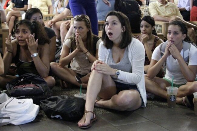 Students at Penn State University react as the NCAA, the body responsible for university-level sports in the US, announces its sanctions against the university football programme following the Jerry Sandusky scandal.  (AP Photo/Gene J. Puskar)