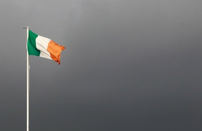 A tricolour blows in the wind as dark clouds appear in Dublin earlier today. Image: Sam Boal/Photocall Ireland.