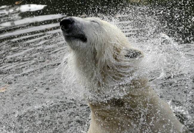 A polar bear shakes its head in its enclosure at Berlin Zoo in Germany. A monument to the polar bear Knut was unveiled at the zoo this morning. Polar bear Knut became a global celebrity before his sudden death last year. (AP Photo/Michael Sohn)