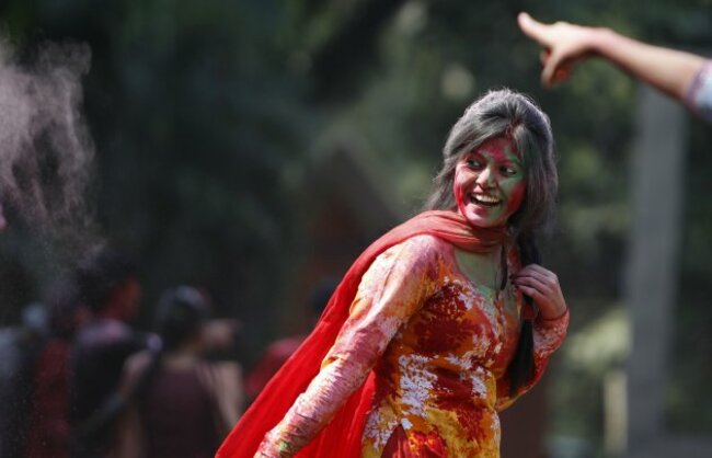 Bangladeshi Hindu devotees apply vermillion to each others’ faces during Durga Puja festivities in Dhaka, Bangladesh. The festival commemorates the slaying of a demon king by lion-riding, ten armed goddess Durga, marking the triumph of good over evil. (AP Photo/A.M.Ahad)