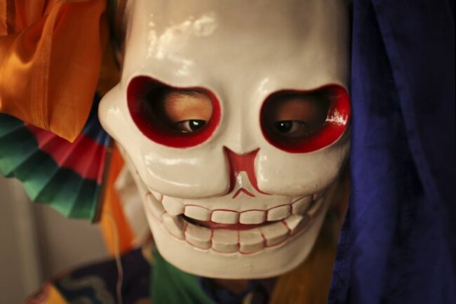 A Tibetan Buddhist monk from the Sherbling Monastery in the Indian state of Himachal Pradesh, wears a mask as he waits before performing a “bone dance” at the closing of the Delhi International Arts Festival in New Delhi, India. (AP Photo/Kevin Frayer)
