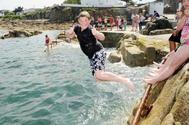 Conor Murphy, 12, from Monkstown takes a splash at the Forty Foot in Sandycove, Dún Laoghaire. That looks like a Leisure Dive to us… (Laura Hutton/Photocall Ireland)