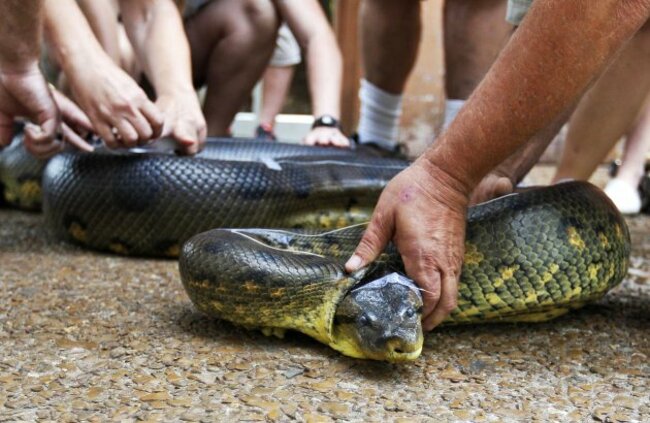 Many hands join in to help as an anaconda snake at the Oklahoma City Zoo has dental floss taped to its head and along its body as it is measured. The floss and tape are necessary because it would be nearly impossible to stretch out the snake. The anaconda weighed 152 lbs – that’s almost 11 stone – and measured 16 feet. (AP Photo/Sue Ogrocki)