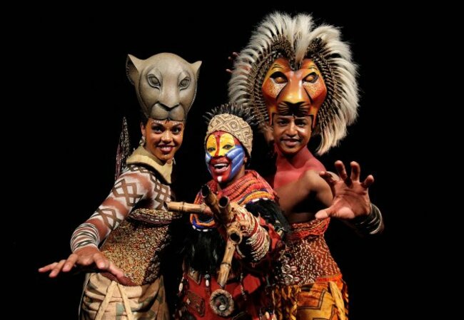 Melina M’Poy (Nala) Gugwana Dlamini (Rafiki) and Johnathan Andrew Hume as (Simba) pictured at the launch of The Lion King musical at the Project arts centre in Dublin. (Niall Carson/PA Wire)
