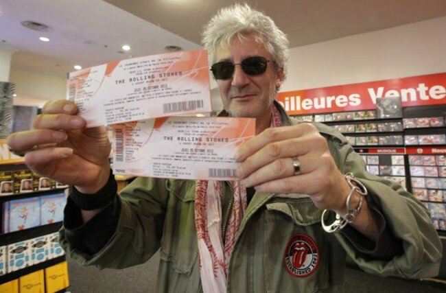 A Rolling Stones fan who named himself Patrice, 55, and who claims he has seen 54 Rolling Stones concerts, shows the tickets he bought for Thursday night’s concert in Paris, Thursday, Oct. 25, 2012. The Rolling Stones announced a surprise “warm-up gig” in Paris, and within an hour the Champs Elysees was swarming with fans hoping to get satisfaction with one of the 350 tickets for the Thursday night show. (AP Photo/Francois Mori)