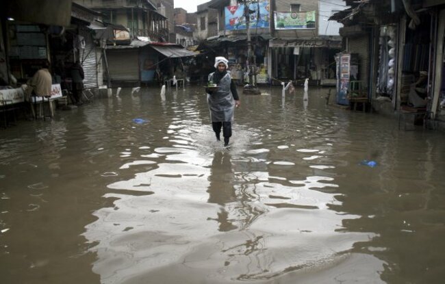 A Pakistani man walks through a flooded street on a rainy day in Peshawar. (Mohammad Sajjad/AP)