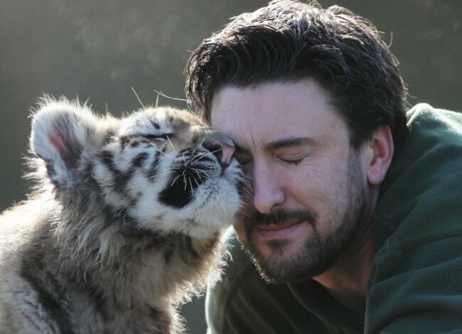 Ben Warren, Head Keeper of Large Carnivores, plays with tiger cub Arina – one of two five-month-old Amur tiger cubs – at Howletts Wild Animal Park near Canterbury, Kent. (Gareth Fuller/PA Wire)