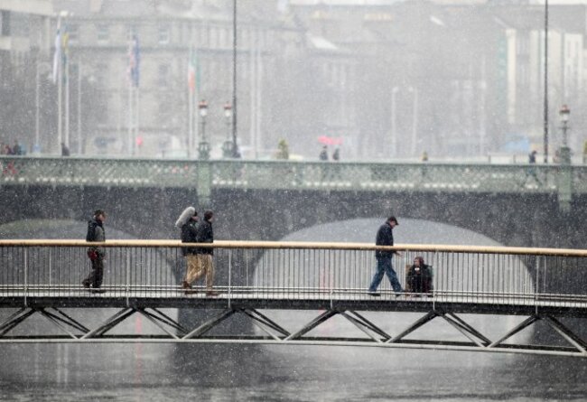 Brrr: People walk across the Millennium Bridge and the Grattan Bridge in Dublin city centre this afternoon as light snow falls (Photo: Sam Boal/Photocall Ireland)