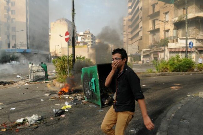 A man covers his mouth as he passes burning garbage containers laid by Sunni protesters, angry at the killing of brigadier general Wissam al-Hassan, to block roads in Beirut yesterday. Photo: Ahmad Omar/AP