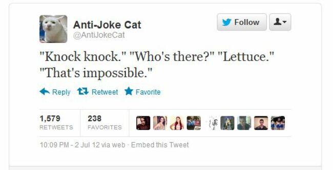 • Continuing the somewhat unprecedented animal theme of tonight’s Fix, are you follow Anti-Joke Cat (Tagline: “I don’t do jokes”) on Twitter? If not, reconsider. With just 183 tweets its already garnered over 100,000 followers. Here’s some sample tweets: