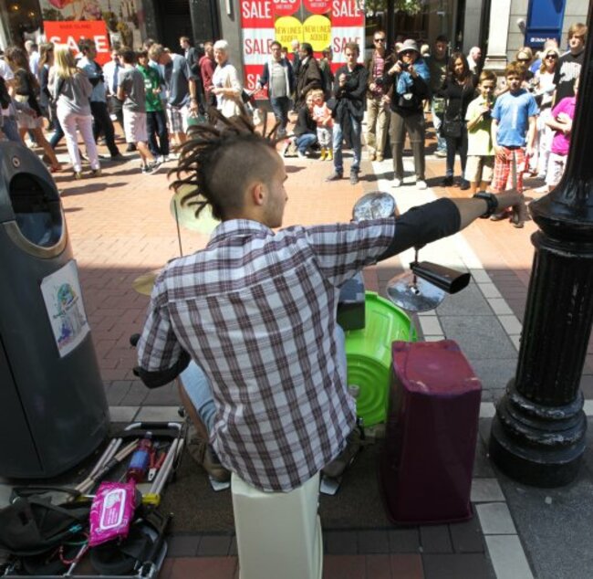 Busker Jack Doyle draws a crowd on Dublin’s Grafton Street today. (Photo: Sam Boal/Photocall Ireland)