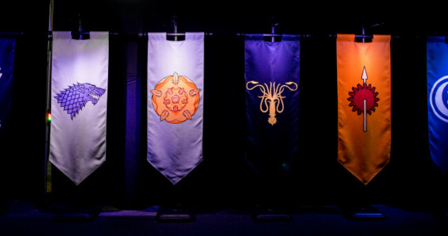Banners carrying the sigils of House Bolton, House Stark, House Tyrell, House Greyjoy, House Martell, and House Arryn, on display at the launch of the Game of Thrones touring exhibition at the Titanic Exhibition Centre in Belfast. PA Wire/PA Images