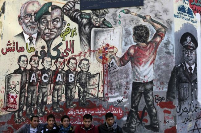 Egyptian boys sit in front of graffiti and Arabic, bottom. that reads, “regime you’re afraid of a paint brush and a pen,” in Tahrir Square in Cairo. (AP Photo/Hassan Ammar)