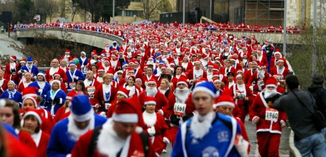Runners dressed in red and blue Santa costumes take part in the RunLiverpool Santa Dash 2012 in Liverpool (Image: Peter Byrne/PA Wire).