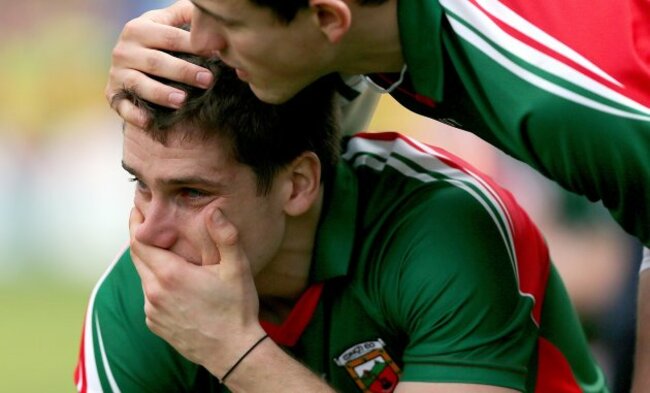 The face of dejection and a comforting arm. Mayo’s Lee Keegan after the final whistle in Croke Park. Image: ©INPHO/James Crombie