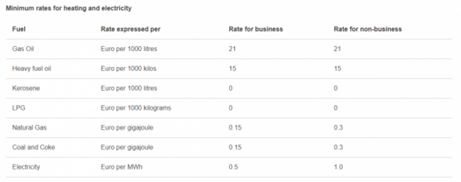 When it comes to minimum rates of tax allowed for heating and electricity under this EU directive, the rate for natural gas, for example, is 15 cent per gigajoule. For heavy fuel oil the minimum allowable rate is €15 per 1,000 kilos.
