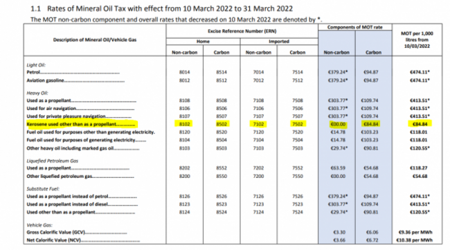 It shows that the non-carbon component of the Mineral Oil Tax – listed under excise duty rates – for “kerosene used for purposes other than as a propellant” (including home heating) is €00.00.