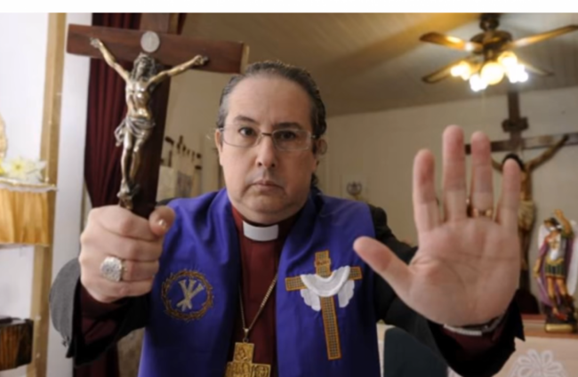 This is not a horror movie. It is a real-life mass at Acuna’s evangelical exorcism school – thought to be one of the first in Latin America.