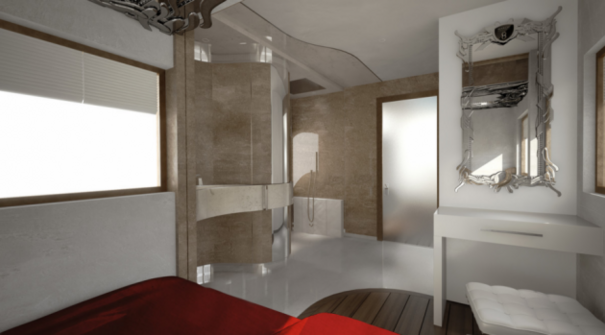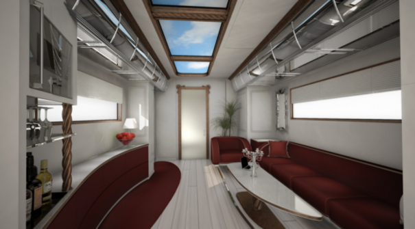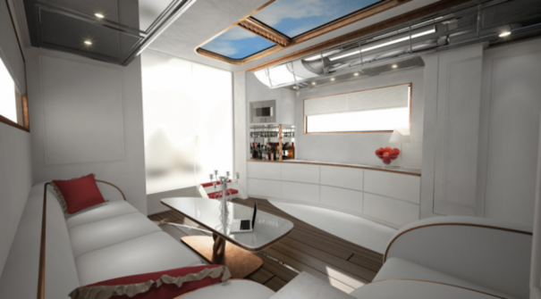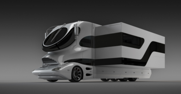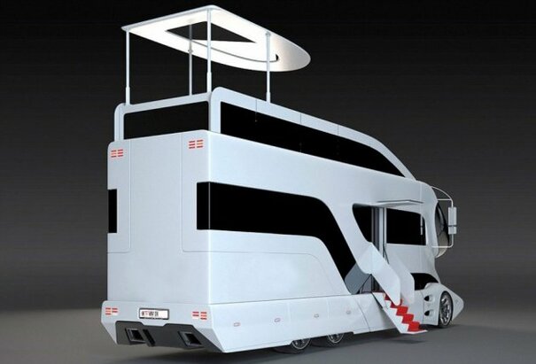 The humongous, 40-foot-long eleMMent Palazzo from Austrian company Marchi Mobile is covered with gold (but is also available in more traditional white) and comes with a ton of luxury features, including a 40-inch flat screen, a pop-up cocktail lounge, a fireplace, a master bedroom, and underfloor heating.