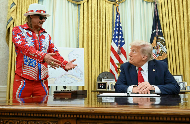 Trump listens to Kid Rock before signing an executive order in the Oval Office of the White House yesterday. Alamy Stock Photo