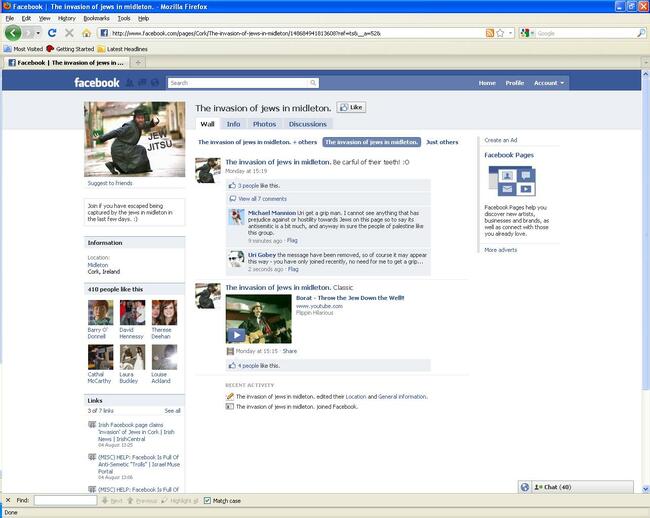 A FACEBOOK GROUP entitled “The invasion of Jews in Midleton” has caused controversy abroad. The facebook group featured in this morning’s Jerusalem Post. The paper said the page “appeared online earlier this week, using words and images that could easily be construed as anti-Semitic.”